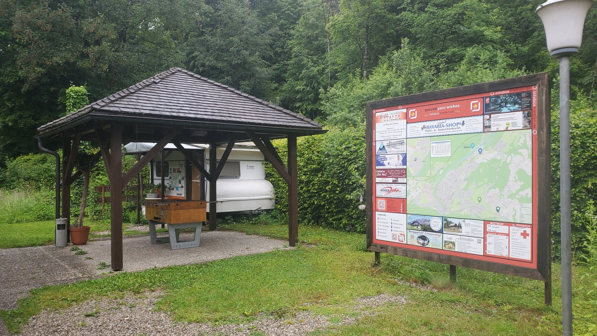 Auf dem Weg zum Platz cruisen wir durch das etwa 1,5 km entfernte Örtchen Piding, das alle Nahversorgungsmöglichkeiten bietet. Am Ende einer Stichstrasse erreien wir den Campingplatz und direkt im Eingangsbereich die Rezeption mit Schranke. Wir melden uns an und werden für die Benutzung der Sanitäranlagen gegen Kaution mit einem elektronischen Dongle ausgestattet, der als Schlüssel für die Zugangstüren des Sanitärgebäudes dient. Für das warme Duschen sind 50-Cent-Stücke erforderlich.