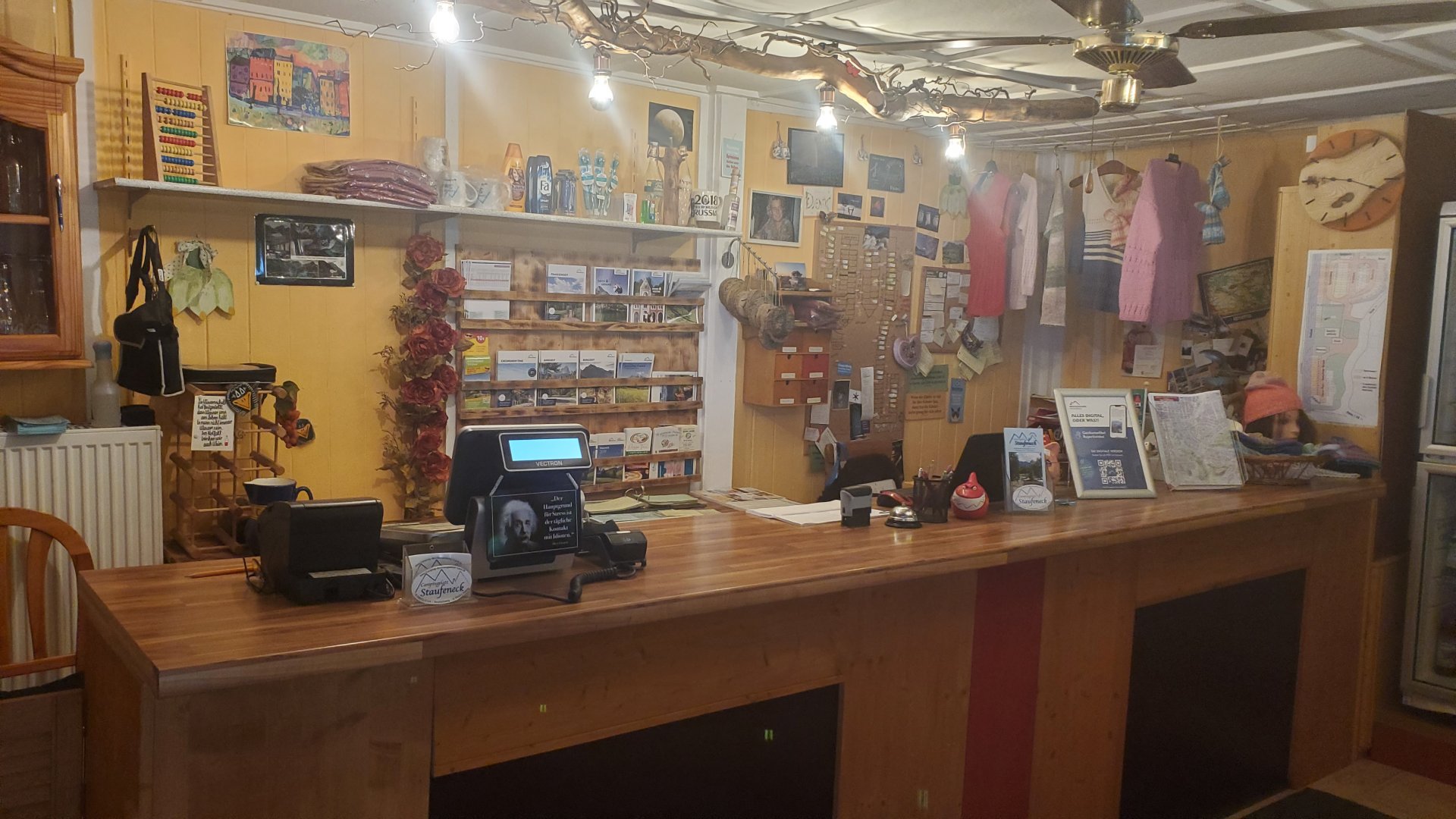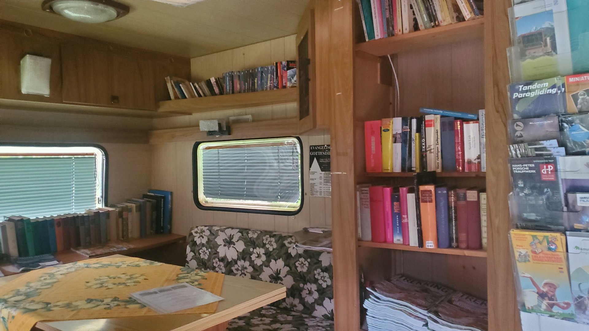 Direkt gegenüber dem Sanitärgebäude befindet sich ein kleiner Wohnanhänger zum freien Zugang für Gäste. Gemütlich mit einer Eckbank rund um einen Tisch und Bücherregalten ausgestattet, lädt der kleine Anhänger zum Verweilen ein, um sich beispielsweise über mögliche Ausflugsziele zu infomieren oder sich ein schönes Buch zum Schmökern auszuleihen. Einfach eine sehr schöne und individuelle Idee.